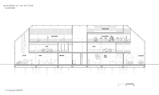 The building, with an area of 1600 m2, is totally covered by a glazing facade, and its is constituted by restaurants, shops, and health-center. To design the facade, MVRDV together with the artist Frank van der Salm, made a photographic study of the traditional local farms to generate an ideal average for the creation of the image that it used for the facade.